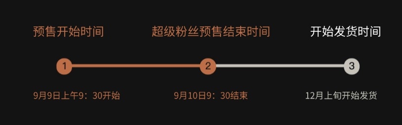 3. 本次预售预计于11月下旬开始发货,第一批超级粉丝价预售链接会限时48小时(48小时后不可购买),补尾款开始时间11月11日。早鸟预售价链接9月10日上架,预售结束时间12月5日,早鸟预售价订单将于超级粉丝价订单发完后发货。